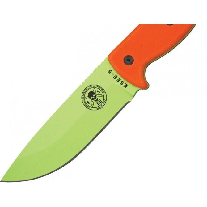 La aleación que compone la hoja pavonada en verde del ESEE Model 5 fue desarrollada en su origen para la construcción de herramientas pesadas. Dispone de una concentración bastante abultada de carbono, de ahí que presente condiciones inmejorables en torno a dureza y durabilidad.