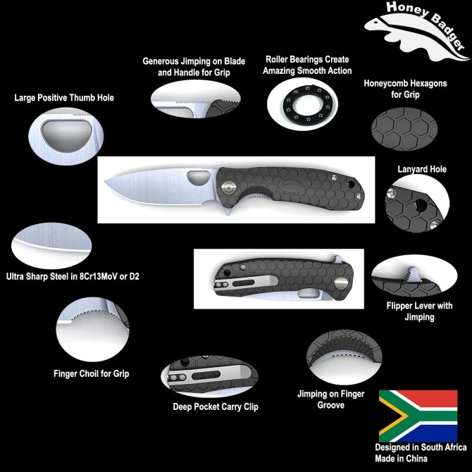 Los desarrolladores de la navaja Honey Badger Medium diseñaron su hoja con un estilo Drop Point, que se caracteriza por la curva convexa cerca de la punta fuerte y robusta. Gracias a ella, el usuario podrá realizar diversos cortes y perforaciones con total control y manejo.