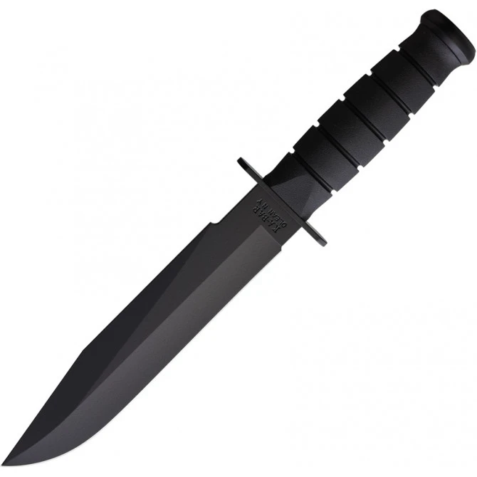 Cuchillo fabricado por Ka-Bar en EEUU, modelo Fighter, con hoja de acero al carbono 1095 Cro-Van, con filo liso. Empuñadura fabricada en kratón (material termoplástico resistente al paso del tiempo). Incorpora también una funda de GRN negra.