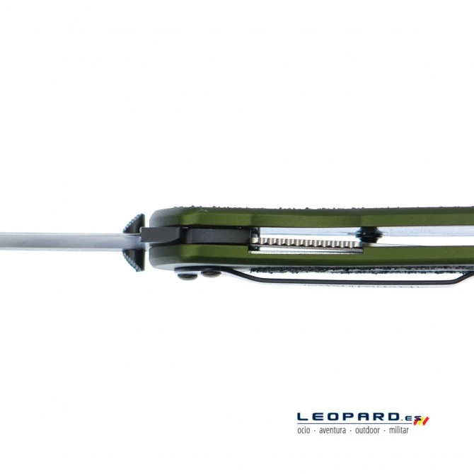 Las cachas de la Blur Tiger ST están fabricadas en aluminio anodizado en acabado color verde. Este material posee las propiedades de ser muy resistente contra impactos y duradero y, a la vez, es muy ligero.