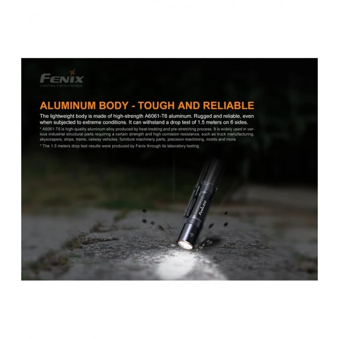 La linterna Fenix E12-V2.0 está fabricada en aluminio anodizado A6061-T6 de alta resistencia Tipo III anti-abrasivo, por lo que puede soportar altas temperaturas. Además, puede resistir a caídas de una altura de 1 metro. También tiene una protección IPX8 para proteger a la linterna de largos periodos de inmersión.