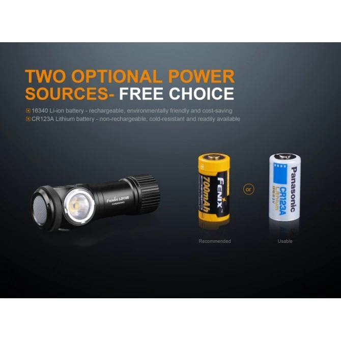 • Alimentada por una batería recargable de Ion-litio 16340 o una batería de litio CR123A
