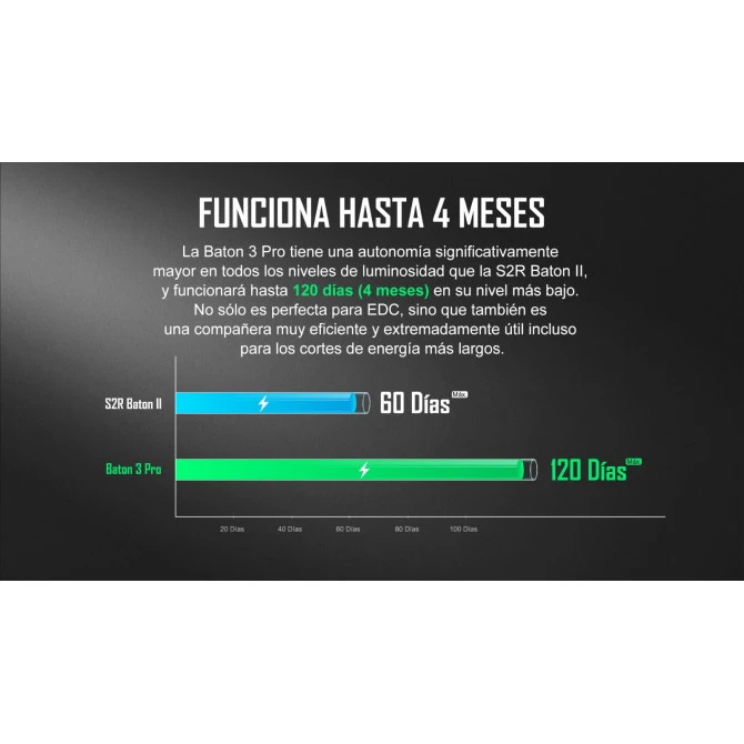 La potencia que posee alcanza los 1500 lm y un alcance de 175 metros, lo supone una mejora del 30% del rendimiento con respecto a la S2R Baton II. Datos que son posibles a través de su batería de 3200mAh que, como una cualidad destacable, tiene una autonomía de 120 días en su nivel más bajo.