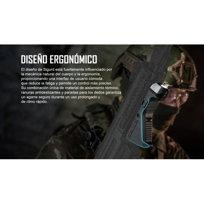 Leopard os presenta una nueva linterna táctica fabricada por Olight, el modelo Sigurd es una impresionante luz de grip angular con un soporte de carríl Picatinny o M-Lok. Incorpora un grip angular ergonómico junto con una linterna de 1.450 lúmenes y tiene un alcance de 240 metros. El grip es antideslizante en la parte interna gracias la las ranuras que lleva y el tope para los dedos, es por ello que el agarre es muy cómodo y además aisla el calor entre el cañón y la mano.