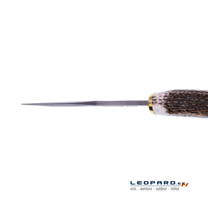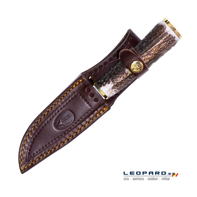 Una de las características más reseñables del cuchillo Braco-11 Dam es su empuñadura natural fabricada en asta de ciervo y virola de latón, que le aporta una belleza única y especial. Además, tiene un pomo desarrollado de igual forma en latón, con un acabado de alta gama.