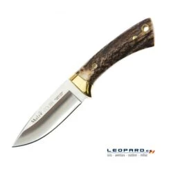 Longitud total 15.4 cm Longitud de hoja 7,4 cm Grosor: 3 mm Acero MoVa Cachas de asta Virola de latón Agujero para fiador