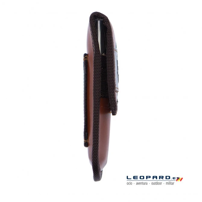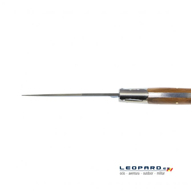 Navaja española fabricada por Muela con hoja de acero MoVa, bloqueo de palanquilla y cachas fabricadas en madera de olivo y alpaca. Incluye funda de piel de color marrón, para pasar por el cinturón.