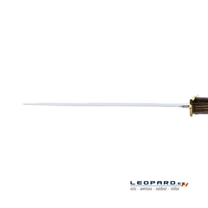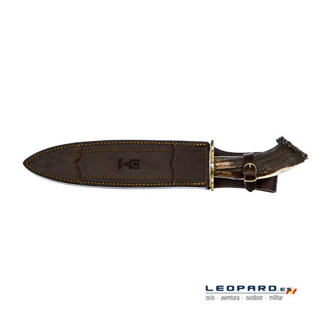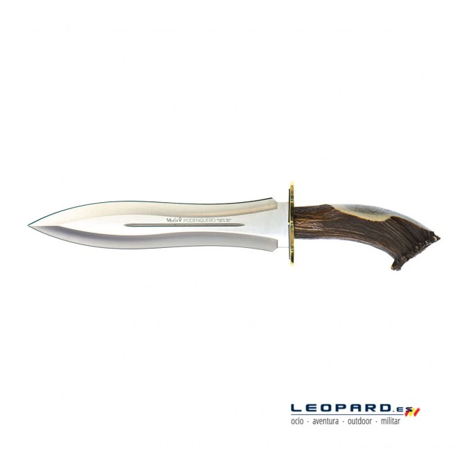 La empresa Muela, referente dentro de la cuchillería española, fabrica piezas que son valoradas en todo el mundo por la calidad de las mismas. En esta ocasión, Muela ha diseñado el magnífico cuchillo Podenquero-S. Se trata de un modelo con hoja enteriza fabricada en acero inoxidable MoVa y empuñadura en asta de ciervo con roseta y defensa de latón. Además, incluye funda de cuero color marrón.