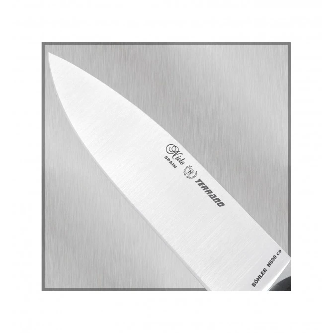 La hoja del Nieto Terrano está desarrollada en esta aleación de altísimas prestaciones, que posee un agregado de cobalto, lo que mejora en gran medida todas sus prestaciones en torno al filo (calidad del afilado, retención y mantenimiento). Además, resiste al impacto y a la corrosión de forma excelente.