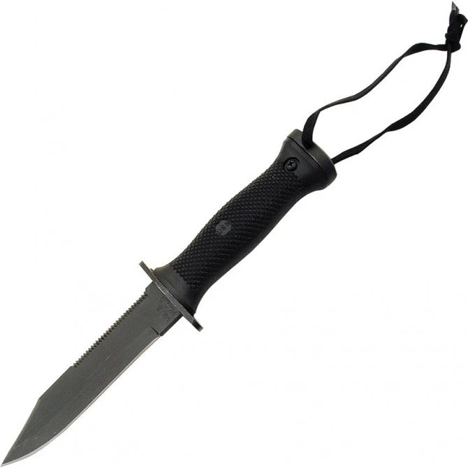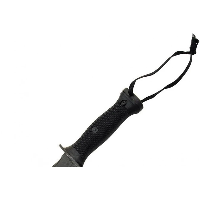 Los diseñadores de la compañía Ontario han fabricado la empuñadura de este cuchillo Mark 3 Navy Combat en polímero en acabado color negro. Se trata de un material antideslizante que, a su vez, cuenta con un tacto texturizado para un mejor agarre. Además, incluye un cordón de color negro.