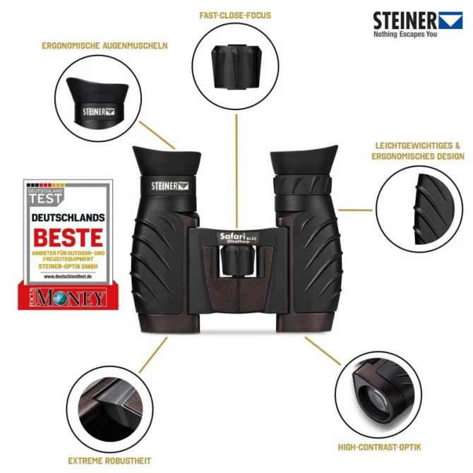 La compañía alemana Steiner ha desarrollado la línea de prismáticos Safari UltraSharp que pertenece a la óptica deportiva de gran rendimiento. Así, el modelo Safari UltraSharp 8×22 está diseñado específicamente para cualquier tipo de aventura o actividad al aire libre ofreciendo una buena calidad de imagen.