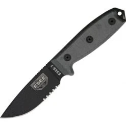 RC3SMB CUCHILLO RAT Cutlery RC-3. 8 1/4″ overall. 3 7/8″ partially serrated «Super Tuff» black textured powder coated 1095 carbon steel blade. Full tang. Gray micarta handles. Molded coyote brown Kydex® sheath with paracord, cord lock, MOLLE lock atttachments and boot clip.