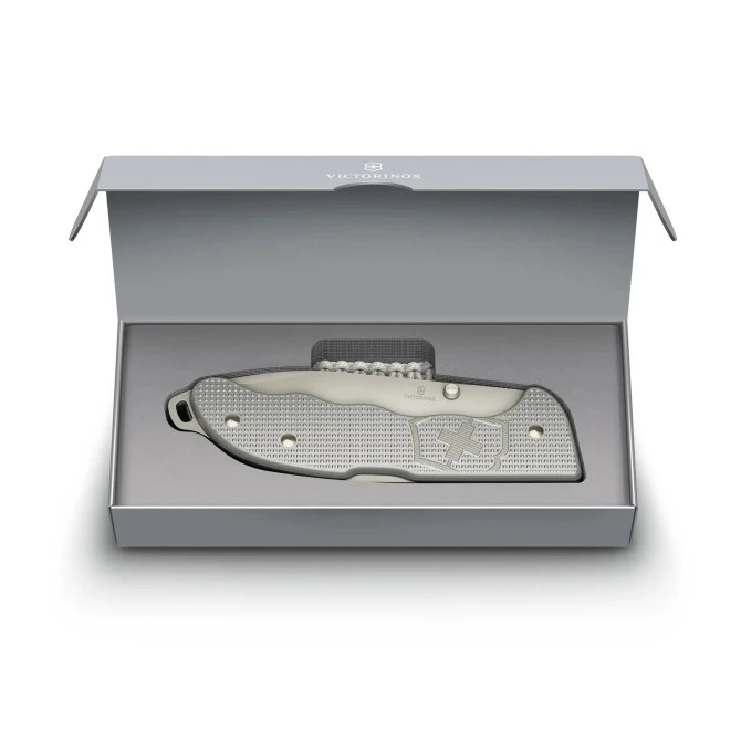 Victorinox ha pensado para este modelo de la serie Evoke que el material que quería usar en las cachas es el aluminio, que aparte de ser muy resistente a la compresión no se arañan con facilidad. Este material nos ofrece una relación resistencia/peso más alta de cualquier otro metal. Este modelo incluye un clip ambidiestro para que todos los usuarios puedan transportarla de forma cómoda en su bolsillo.